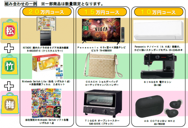 期間中、イオンモール含めてイオンの店内では家族向けのイベント企画を約600回以上実施する。主な企画では3つの商品を組み合わせて10~25万円の特別価格で「松竹梅プレミアムセット」を初めて実施する。例えば20万円セットでは松として庫内カメラ付き6ドア冷凍冷蔵庫、梅は任天堂ゲームスウィッチ、竹は同ゲームソフト各種1本といった組み合わせで販売する。