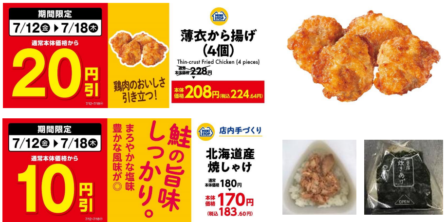 流通スーパーニュース > 販促 > ミニストップnews|7/12~18、店内調理の唐揚げとおにぎりをセール販売 ミニストップnews|7/12~18、店内調理の唐揚げとおにぎりをセール販売 販促 / 2024年07月12日 ツイート ミニストップ(株)(千葉市美浜区、藤本明裕社長)は7月12日(金)~7月18日(木)の1週間、店内調理の惣菜とおにぎりのセールを開催する。 惣菜の定番人気商品「薄衣から揚げ(4個)」を通常本体価格から20円引き、手づくりおにぎりの定番人気商品「北海道産焼しゃけ」を本体価格から10円引きで販売する。 ツイート