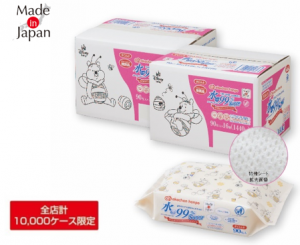 不純物を徹底的に除去し、超純水を99%以上使用している。残り1%の成分も厳選し、防腐剤を必要最小限に抑え、デリケートな赤ちゃんの肌にもやさしい新生児から使えるおしりふき・手口ウェットのシリーズ。90枚×16個で 2948円(税込み、以下同じ)。