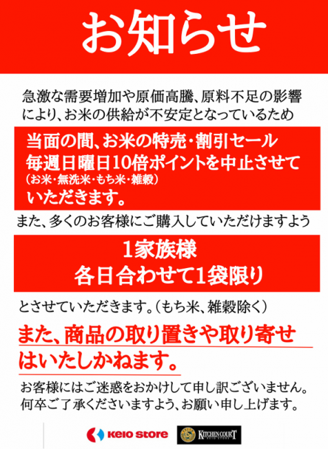 京王グループの(株)京王ストア (東京都多摩市、川田裕史社長)は米販売について一部変更を行っている。需要増加による品薄や原価高騰を理由に挙げたもので、当面の間、特売・割引セールや毎週日曜日に実施する10倍ポイントセールを中止する。また1家族当たり各日1袋限りの販売としている。