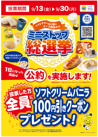 商品ごとに選挙公約(セール等)をかかげ、投票結果で1位となった商品はその公約を実施する。総選挙の結果は、10月4日(金)に、ミニストップホームページ、リリースで発表する。