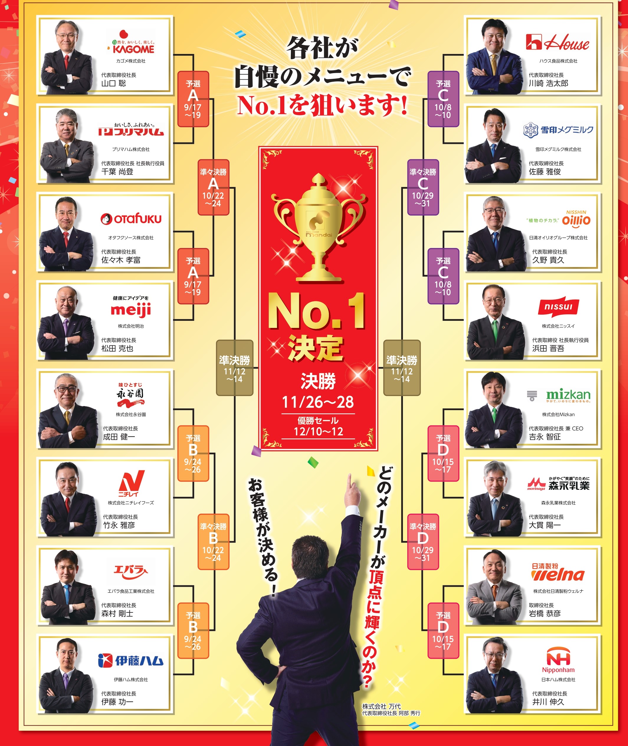 人気メーカー16社の自慢のメニューを、万代アプリユーザーの投票によって競い合う。優勝メーカーに投票した顧客には、抽選で2000名に万代ポイント500ポイントをプレゼントする。新規アプリユーザーを促す仕掛けでもある。