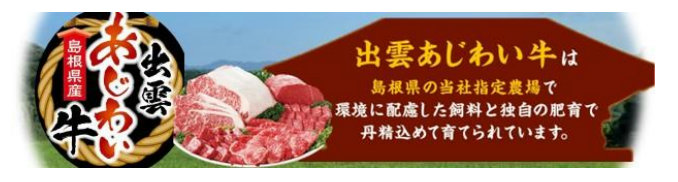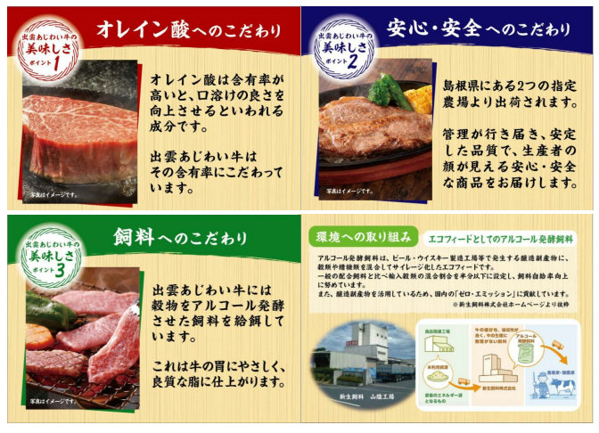 新「出雲あじわい牛」のおいしさの理由は3つ。1つ目は「オレイン酸へのこだわり」。牛肉のおいしさの要因の一つ「オレイン酸」を豊富に含んでおり、とろけるような口どけの良い脂が特徴だ。2つ目は「安心、安全へのこだわり」。健康管理・衛生管理を徹底した環境下で1頭1頭育てている、約20年の取引実績のある信頼できる指定農場の牛を使用している。3つ目は「飼料へのこだわり」。飼料にアルコール発酵させた穀物を給餌しているので、牛の腸内環境を整え、良質な脂に仕上げている。