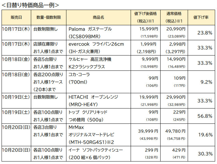 また10月17日(木)から10月20日(日)の期間、目玉商品として数量限定の日替り特価商品を販売する。