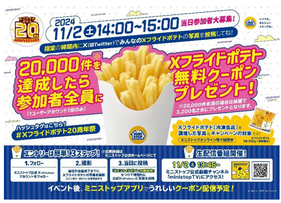 ミニストップ公式X(旧Twitter)アカウントをフォローして、「#Xフライドポテト20周年祭」をつけて、Xフライドポテトの画像を投Xフライドポテトフライドポテト無料クーポンを付与する。2万件未達成の場合は、抽選で3200名へのプレゼントとなる。