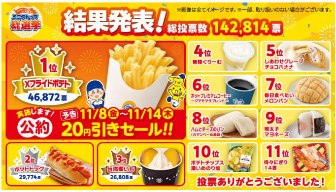 ミニストップは、9月13日(金)~9月30日(月)の期間、顧客参加型のミ「ニストップ総選挙「を実施。期間中の総投票数は14万2814票となり、「Xフライドポテト」は4万6872票を集めて1位となった人気商品だ。
