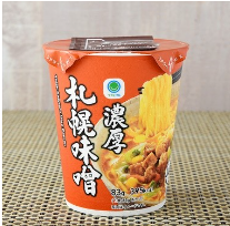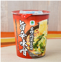 6種類の野菜が入った旨辛味噌ラーメン。味噌とポークエキスをベースに、ガーリック・唐辛子・ごまでアクセントをつけた旨辛いスープが特長。価格213円。