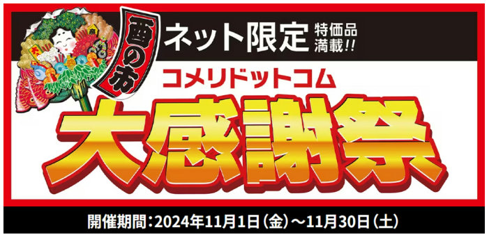 (株)コメリ(新潟県新潟市、捧雄一郎社長)は11月1日(金)から11月30日(土)までの期間、オンラインショッピングサイト「コメリドットコム」で、ネット限定の大特価セール「酉の市 コメリドットコム大感謝祭」を開始する。