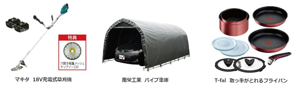 商品一例として、「マキタ 18V充電式草刈機(バッテリー2個付き)」が税込価格で4万4800円(以下同)、「南榮工業 パイプ車庫」3万9800円「T-fal インジニオ・ネオ 取っ手がとれるフライパン・鍋9点セット」1万4800円などを提供する。数量限定として、「ECOFLOWポータブル電源」が4万9800円、「新潟精機 PAOCK 自動カンナ」6万9800円などのお買い得商品も揃える。