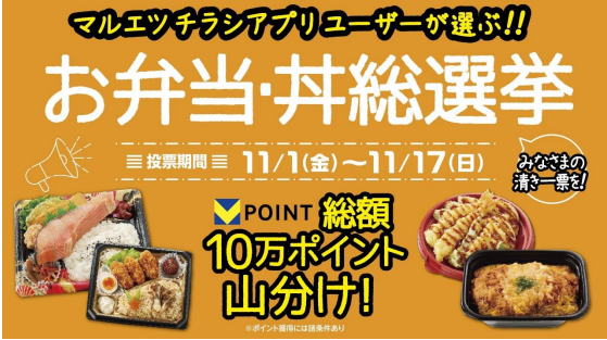 投票対象となる商品は、厚切り鮭弁当 かきフライ弁当、ごま油香る!3 種の野菜と海老イカ天丼、自社製出汁を使ったロースカツ丼などマルエツオリジナルの弁当と丼全38商品。期間中に投票する際、マルエツ店頭で V ポイントが貯まるカードを提示し、200円(税抜き)以上の買物客を対象に、V ポイント総額10万ポイントを山分けでプレゼントされる。