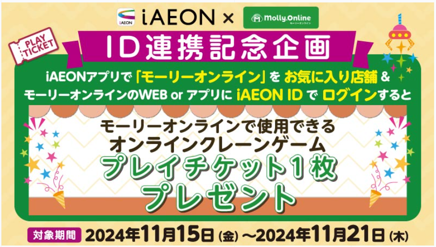 一つは、11月15日(金)から11月21日(木)までの期間中、iAEONアプリで「モーリーオンライン」をお気に入り登録し、 「モーリーオンライン」にiAEON IDでログインされた人に、もれなく「モーリーオンライン」のオンラインクレーンゲームが利用できる「プレイチケット」1枚をプレゼントする。iAEONの新規会員・既会員ともが対象だ。