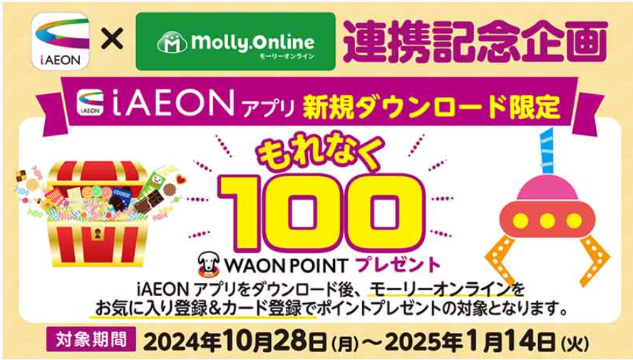 もう一つは、11月1日(金)から2025年1月14日(火)までの期間中、iAEONアプリを新規ダウンロードし、 新規会員登録およびカード登録の上、「モーリーオンライン」をお気に入り店舗登録されたお客さまに、もれなく100WAON POINTをプレゼントする。