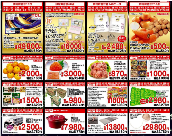 食料品(肉、果物、飲料、冷凍食品セット等)アクセサリー、ゲームソフト、おもちゃ、家電製品、一般消耗品、健康飲料などが数量限定で販売される。