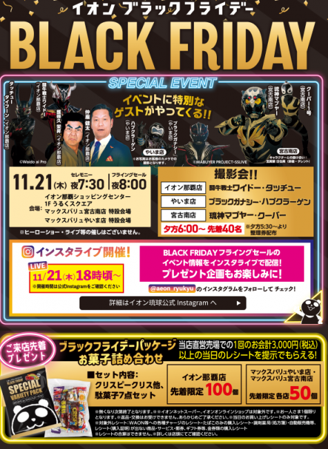また11月21日(木)20時からは、イオン那覇店、マックスバリュやいま店、マックスバリュ宮古南店の3店舗でブラックフライデー‟フライング”セールを実施する。3店舗ではそれぞれ、タレントやゲストがイオン琉球のInstagramアカウントからライブ配信する。それ以外にも、96円均一、詰め放題企画やキャラクターショーおよび撮影会、20時以降に3000円以上購入で菓子詰め合わせをプレゼントするなど、盛りだくさんだ。