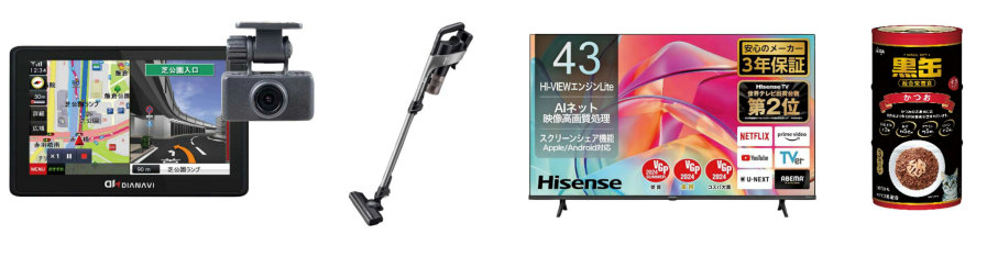 セール品の一例として、「7インチ リアカメラ搭載ナビ」は値下げ率44.4%の本体価格9999円(以下同)で、「SHARP サイクロンクリーナー」は値下げ率33.4%の2万9990円で、「Hisense 43型4K内蔵テレビ」は値下げ率33.0%の4万円で、「アイシア 黒缶3P各種」は値下げ率17.6%の299円で販売する。
