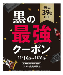 さらに12月4日(水)までの期間、アプリ会員限定で「黒の最強クーポン」を開催する。レジで会員証を提示するだけで「黒」を基調とした対象商品の家電製品や日用品・消耗品が、最大で39%OFFとなる会員限定企画となる。