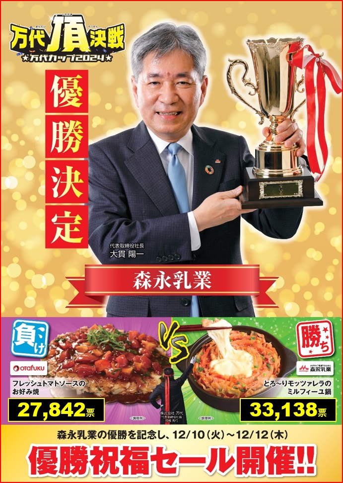 (株)万代(大阪府東大阪市、阿部秀行社長)が9月17日(火)~11月28日(木)の約2カ月間実施した、「万代頂(いただき)決戦――万代カップ2024」で「森永乳業株式会社」が優勝した。