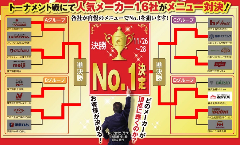 万代カップに参加したのは、伊藤ハム(株)、エバラ食品工業(株)、オタフクソース(株)、カゴメ(株)、(株)永谷園、日清オイリオグループ(株)、(株)日清製粉ウェルナ、(株)ニッスイ、(株)ニチレイフーズ、日本ハム(株)、ハウス食品(株)、プリマハム(株)、(株)Mizkan、(株)明治、森永乳業(株)、雪印メグミルク(株)の16社。