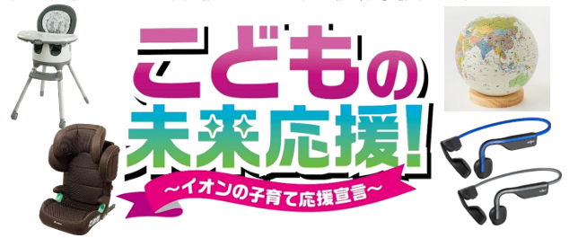「こどもの未来応援! ~イオンの子育て応援宣言~」企画では、小さな子どものいる人やこれから赤ちゃんを迎える人にもうれしいジュニアシートやベビーチェアなどの子ども用品、新たに児童手当が支給される高校生におすすめの商品学習支援につながる文具や日用品などを厳選して、児童手当の支給額に合わせた「1万円セット」「1万5千円セット」など特別価格で提供する。