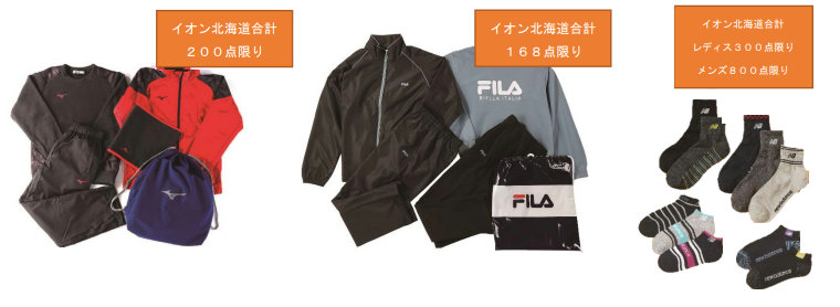 「キッズ MIZUNO福袋 4点セット」で1万円、「メンズ FILA福袋 4点セット」で5000円、「レディス・メンズ ニューバランスカジュアルソックス福袋」で1000円などが登場する。