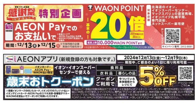 そのほか、12月13日(金)~15日(火)の期間にWAON POINT基本の20倍キャンペーンや、食料品や衣料品、暮らしの品が5%OFFになるクーポンの配信なども展開する。
