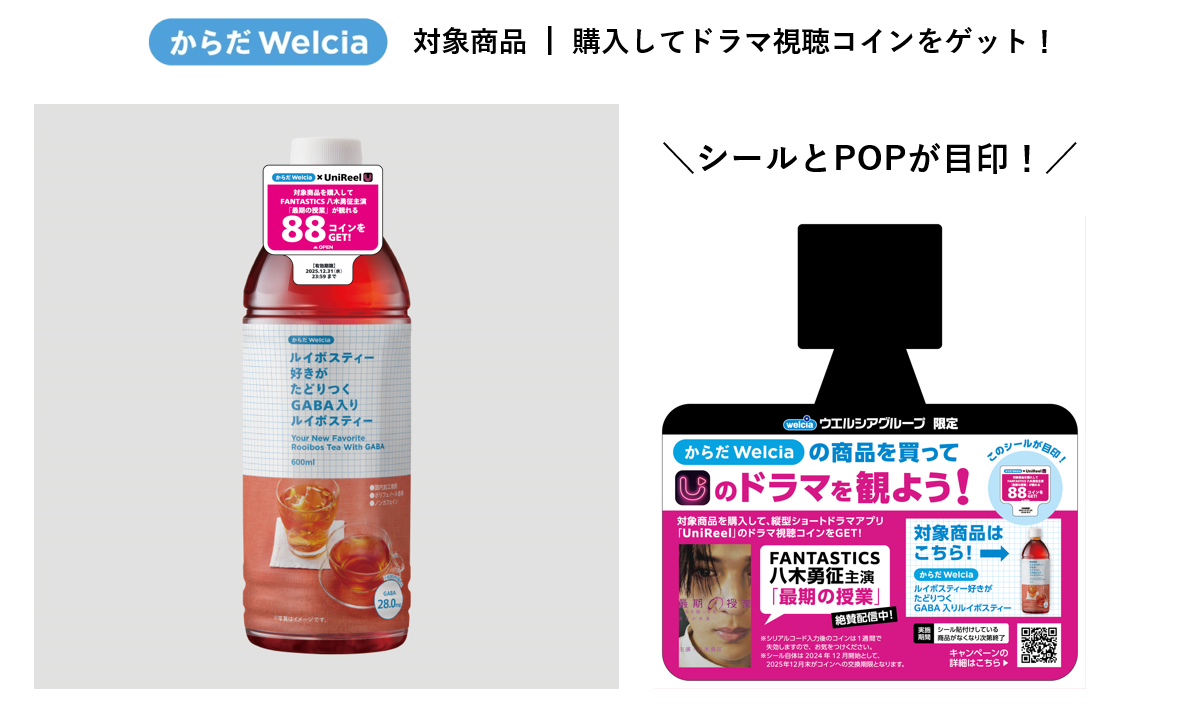ウエルシア薬局では、その第1弾となるドラマ「最期の授業-生き残った者だけが卒業-」に合わせ、「からだWelcia」の対象商品を購入してドラマの視聴コインを取得できるキャンペーンを実施する。顧客は対象の購入商品に貼付されているシールのシリアルコードを「UniReel」アプリに入力することでドラマの視聴コインを取得できる。