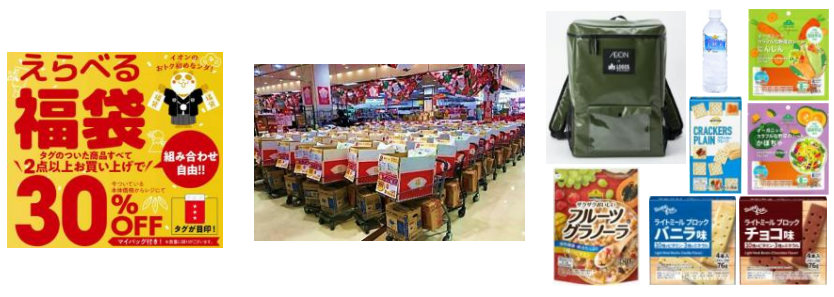 食品や家電を買物カートにお得に詰合せた「福カート・家電福カート」、対象の衣料品から好きな組み合わせで2点以上選んで30%引きになる「えらべる福袋」、また能登半島地震から防災を意識した商品として「LOGOS」とコラボしたオリジナル防災リュックにトップバリュ商品を詰合せたローリングストック福袋など、多様なお得商品・企画を用意する。