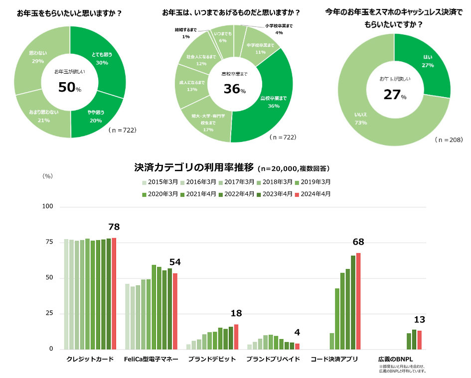 「2024年お年玉に関する実態調査」によると、20代以上の男女5割が「お年玉が欲しい」と回答。しかし、「お年玉はいつまであげるものだと思うか」という質問に対しては「高校生まで」との回答が最多となった。
