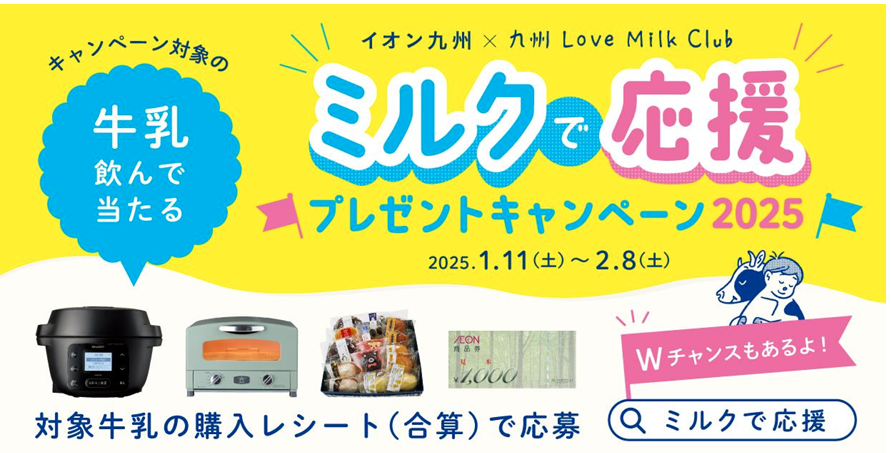 イオン九州(株)(福岡市博多区、中川伊正社長)は、九州生乳販売農業協同組合連合会(九州Love Milk Club、福岡市博多区、中村隆馬代表理事会長)と、1月11日(土)から2月8日(土)までの期間、「ミルクで応援プレゼントキャンペーン2025」を実施する。九州内の「イオン」「イオンスタイル」「マックスバリュ」「マックスバリュエクスプレス」「ザ・ビッグ」「ウエルシアプラス」261店舗で展開する。