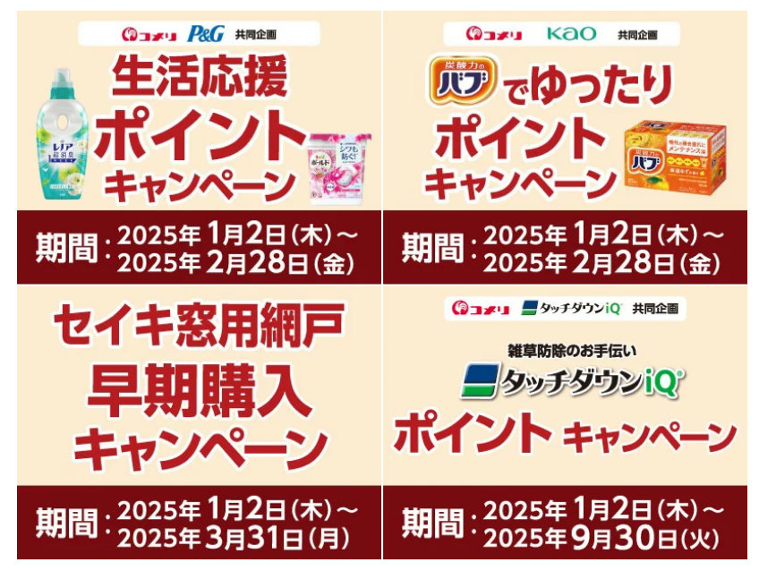 (株)コメリ(新潟県新潟市、捧雄一郎社長)は1月から、コメリの決済手段「コメリカード」「アクアカード」会員向けに4種のキャンペーンを新たにスタートした。