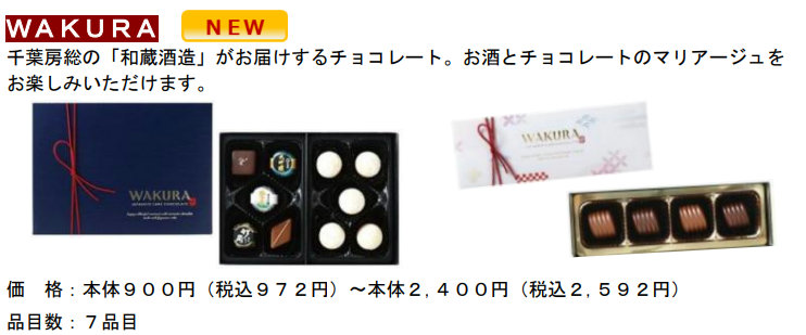 さらに、家でゆっくりチョコレートを堪能できる商品として、千葉県房総の「和蔵酒造」のショコラなど、酒を使ったチョコレートも豊富に取り揃える。