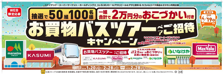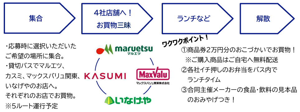 その統合記念企画第2弾として、4社のスーパーマーケットをバスで巡りながら買物を楽しんでもらう「お買物バスツアー」の応募受付を1月20日(月)からWEBで開始した。4社それぞれのおすすめ商品を案内しながら、日ごろ利用の店舗以外のスーパーマーケットにも親しんでもらうツアー企画だ。4月に開催する。
