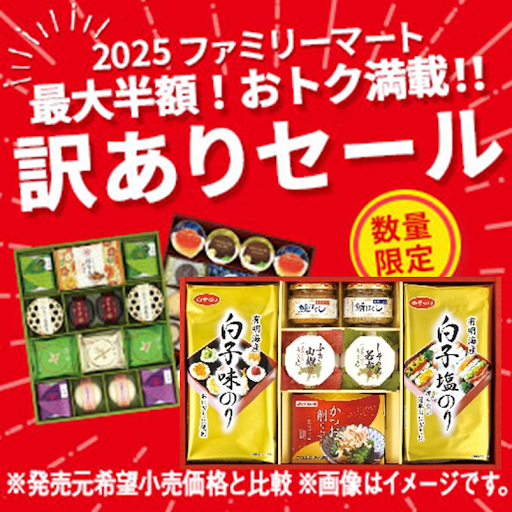 (株)ファミリーマート(東京都港区、細見研介社長)は1月14日(火)から特設サイトwを開設してで、2月13日(木)17:59まで、歳暮ギフトの余剰在庫を最大半額(発売元希望小売価格との比較、以下同)の割引価格で提供する「訳ありセール」を開催している。
