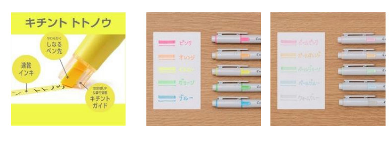 ペン先のチップ両端に付けられたガイド「キチントガイド」が紙面に当たることで筆記が安定し、まっすぐな線を引きやすくなっている画期的な蛍光ペン。1本当たり税込み価格132円(以下同)。6本セットで各660円。