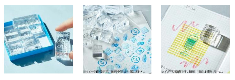 全てのパーツが透明で作られたスタンプ。上から印面が見えるので、細かい位置調整が可能。各2640円。