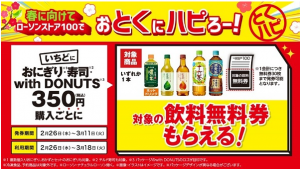 ①おにぎり・寿司・with DONUTS各種を350円(税こみ)購入するごとに、対象の飲料無料券がもらえる。