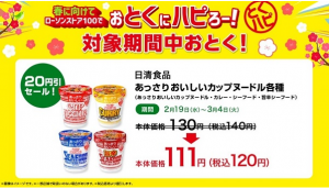 2月19日(水)~3月4日(火)の期間、日清食品の「あっさりおいしいカップヌードル各種(あっさりおいしいカップヌードル/カレー/シーフード/旨辛シーフード)」が値引きされる。
