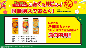 3月5日(水)~3月18日(火)の期間、東ハトの「ハーベスト(バタートースト/香ばしセサミ/こんがりシュガー)のいずれか2個購入するごとに1セットにつき税込み価格より30円引きとなる。