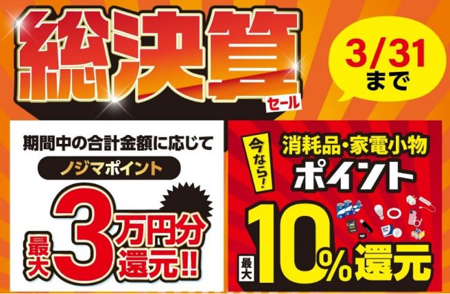 流通スーパーニュース > 販促 > ノジマnews|2/21~3/31史上最大還元の「総決算セール」を開催 ノジマnews|2/21~3/31史上最大還元の「総決算セール」を開催 販促 / 2025年02月27日 ツイート (株)ノジマ(神奈川県横浜市、野島廣司社長)は2月21日(金)から3月31日(月)までの期間、「総決算セール」を開催する。 電池、電球などの消耗品・家電小物が最大10%ポイント還元されるほか、購入金額に応じて最大3万円分のポイントを還元する。同社は、史上最大の還元に挑戦しているという。 また同時開催中の「新生活応援セール」では、冷蔵庫・洗濯機のお得なセットや購入特典を用意する。 ツイート