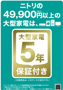 (株)ニトリ(札幌市北区、似鳥昭雄会長兼社長)は、4万9900円(税込み、以下同じ)以上の大型家電商品を5年保証付きで3⽉1日から販売している。対象となるのは、テレビ・冷蔵庫・洗濯機・エアコンのうち同社が指定するものとなっている。5年保証の内訳は、メーカーの保証1年+ニトリの保証4年。