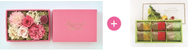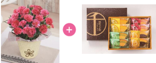 品揃えでは、好きな組み合わせを選べる「フラワー&スイーツセット」では、「カーネーション(ももりーな)&『銀座千疋屋』銀座フルーツクーヘン」(950円 税抜 以下同)、「『カーネーション鉢植え』&文明堂カステラ」(5000円)。