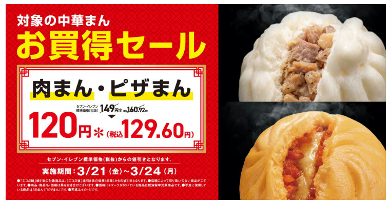流通スーパーニュース > 販促 > セブン-イレブンnews|3/21から「肉まん・ピザまん」29円引きで期間限定発売 セブン-イレブンnews|3/21から「肉まん・ピザまん」29円引きで期間限定発売 販促 / 2025年03月19日 ツイート (株)セブン-イレブン・ジャパン(東京都千代田区、永松文彦社長)は3月21日(金)から3月24日(月)までの期間限定で、「肉まん」「ピザまん」が税抜29円引きとなるお買い得セールを実施する。 行楽シーズンになるこの季節には、人の動きが増加しワンハンドでたべられる温かい商品が人気になることから、お買い得セールを実施する。「肉まん」「ピザまん」を購入すると29円引きの120円(本体価格)となる。 ツイート