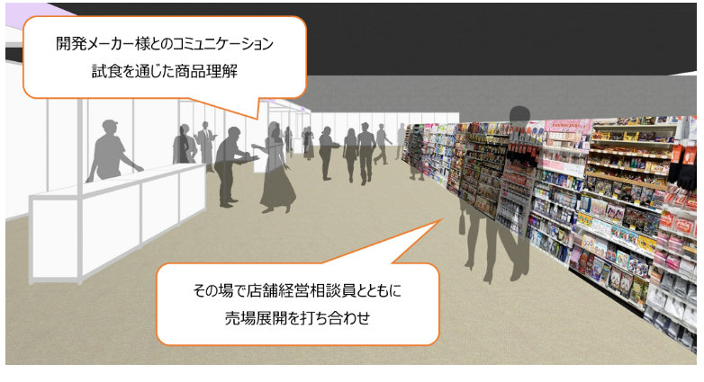 「価値伝達の強化」では、各本部のトップが動画で方針を説明し、関連商品を試食しながら売場展開例を実際に確認できるコミュニケーションコーナーを設置。商品の売場展開について担当の店舗経営相談員とその場で打ち合わせが可能となる。
