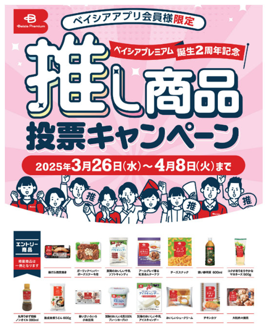(株)ベイシア(群馬県前橋市、相木孝仁社長)は3月26日(水)から、「ベイシアプレミアム誕生2周年記念 推し商品投票キャンペーン」を開始した。