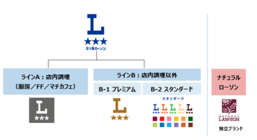 「3つ星ローソン」ブランドの下、店内調理ラインAとそれ以外で区分けをする。ラインB(店内調理以外)内ではプレミアム/スタンダードでの区分けをする。