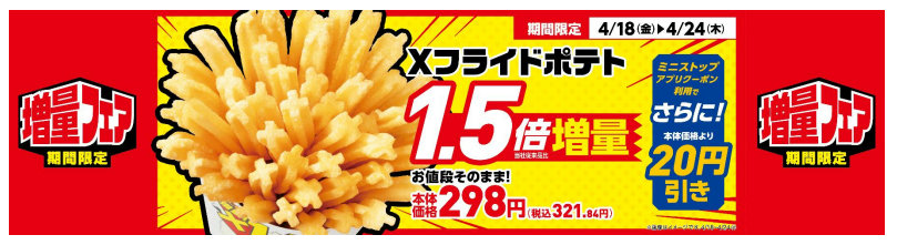 ミニストップ(株)(千葉市美浜区、藤本明裕社長)は4月18日(金)~4月24日(木)の期間、「X(エックス)フライドポテト」の1.5倍増量セールを、全国のミニストップ店舗1815店で実施する。