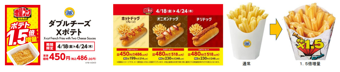 セールでは、「Xフライドポテト」「ダブルチーズXポテト」「ホットドッグ各種のXポテトセット」のXフライドポテトが値段はそのままで1.5倍増量する。Xフライドポテトは本体価格298円(以下同)、ダブルチーズXポテトは450円。ホットドッグ各種のXポテトセットもXフライドポテトの量が1.5倍に増量する。