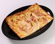フランス・アルザス地方の郷土料理で、レストランやカフェでよく食べられるメニュー。薄いピザ生地にチーズソース・ベーコン・玉葱をトッピングし、超高温で焼き上げたフランス風のピザ。2枚で250円、4枚で498円。