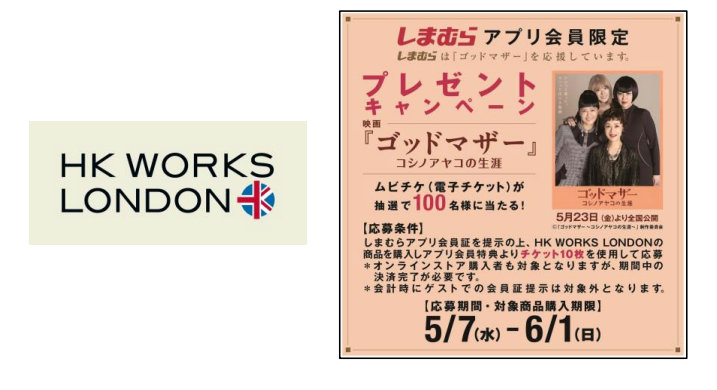 応募方法は、しまむらアプリの会員証を提示の上「HK WORKS LONDON」の商品を購入。アプリ会員特典より「チケット10枚」を使用して応募する。応募期間・対象商品購入期間は5月7日(水)~ 6月1日(日)。
