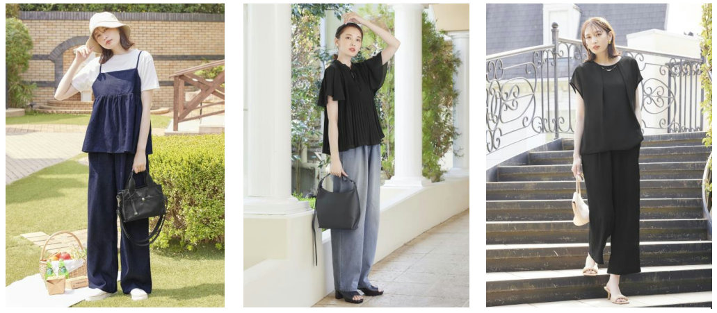 そのほか5月7日(水)から新商品を販売する。左「セットアップ」2420円(税込み価格、以下同)、真ん中「ブラウス」2189円・「コクーンパンツ」2420円、右「プルオーバー」1419円・「イージーパンツ」1639円。